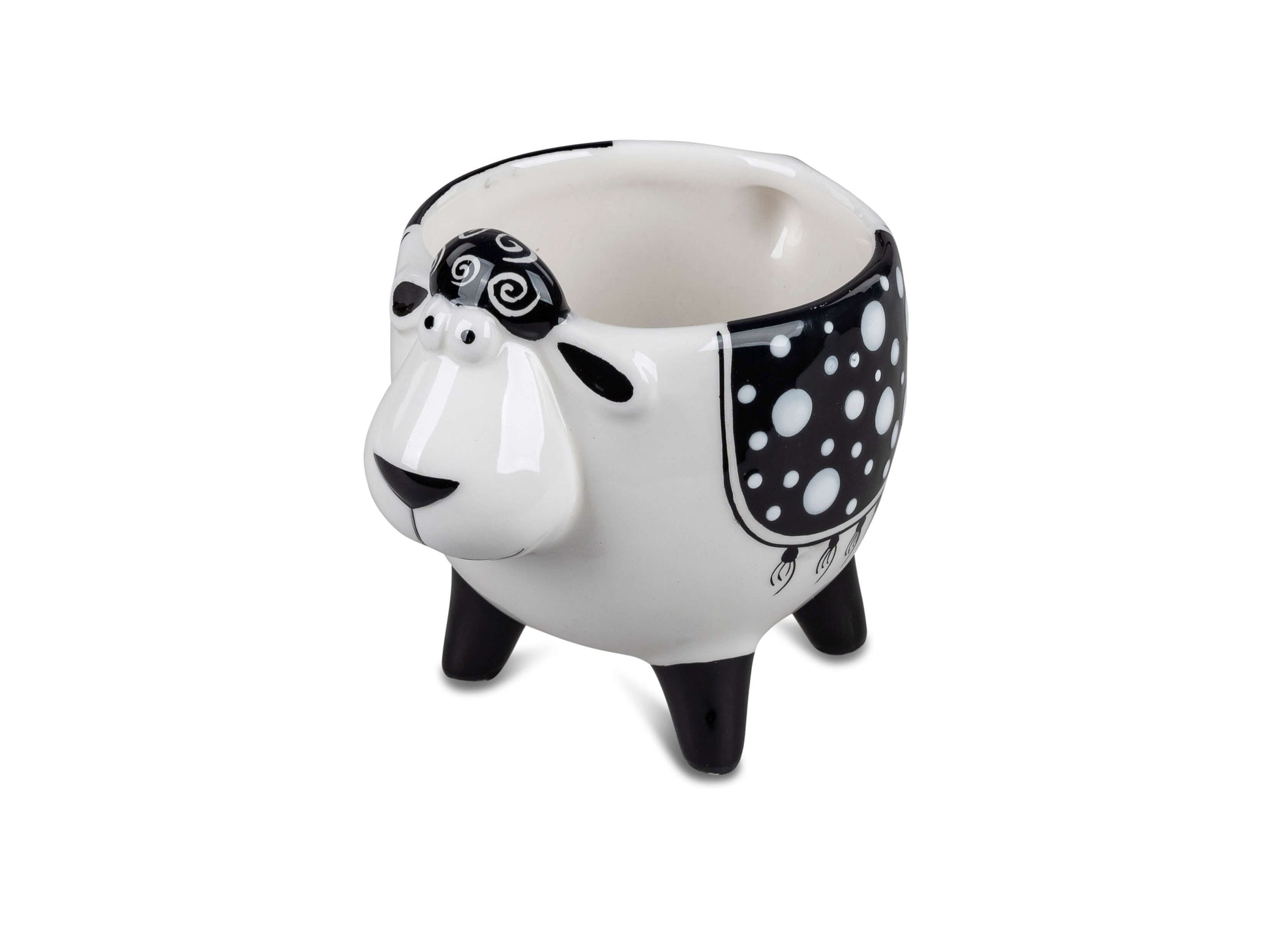 Verleihen Sie Ihrem Zuhause eine charmante und rustikale Note mit unserem exquisiten Deko-Gefäß in Form eines Schafes. Dieses einzigartige Stück ist aus hochwertigem, glasiertem Steingut gefertigt und besticht durch seine schwarz-weiße Verzierung, die ihm eine elegante und dennoch verspielte Ästhetik verleiht.