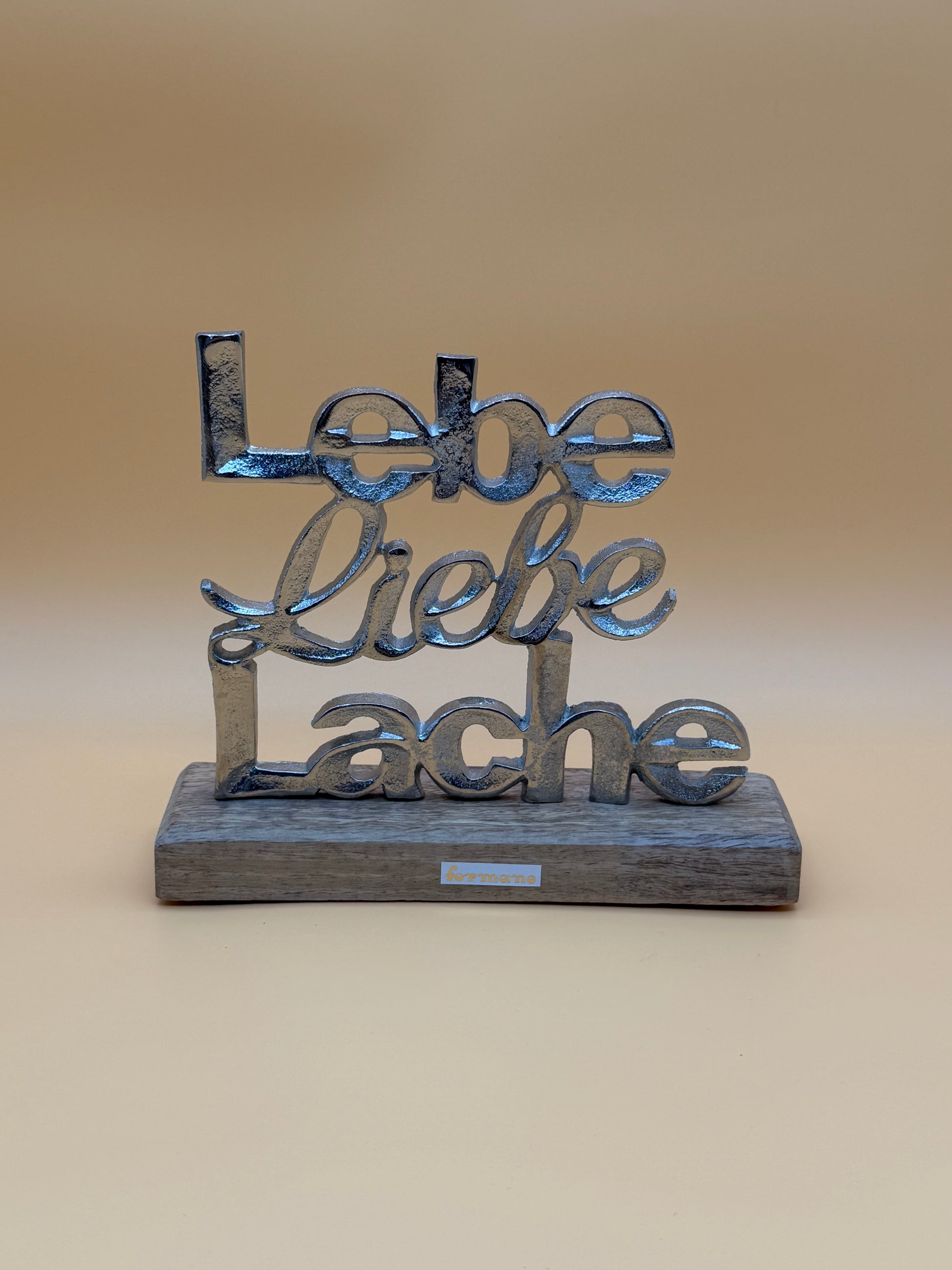 Verleihen Sie Ihrem Zuhause mit diesem Aufsteller aus mattem, silbernem Aluminium und massivem Mangoholz einen Hauch von Eleganz und Luxus. Der Schriftzug "Lebe Liebe Lache" erinnert Sie jeden Tag daran, das Leben in vollen Zügen zu genießen. Ein stilvolles Accessoire mit tieferer Bedeutung.