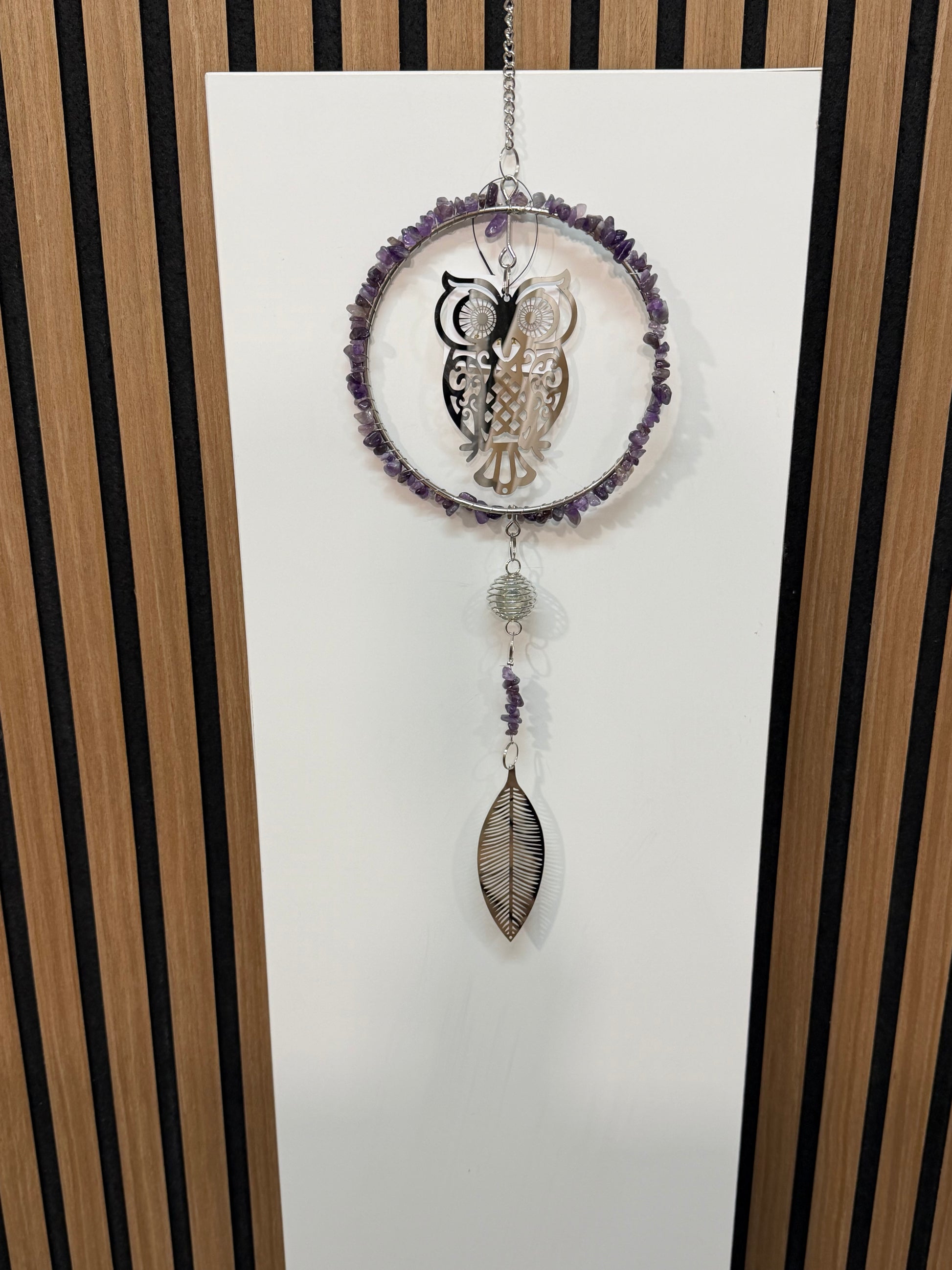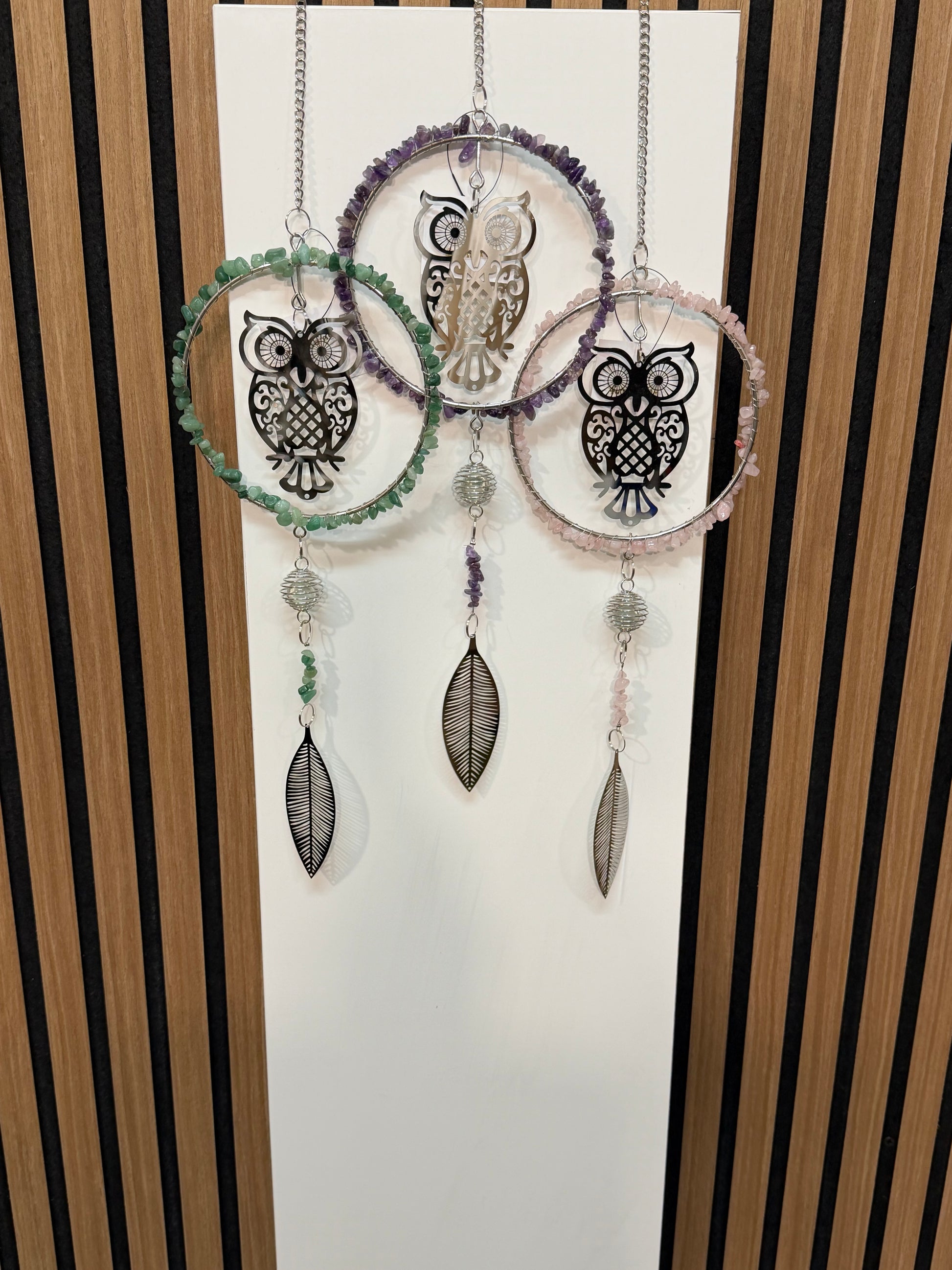 Dekorativer Eulenhänger mit einer Länge von 38 cm, bestehend aus drei kontrastierenden Steinfarbvarianten. Das durchdachte Design kombiniert natürliche Materialien mit zeitloser Ästhetik und eignet sich ideal als Wanddekoration oder Raumaccessoire für anspruchsvolle Inneneinrichtung.