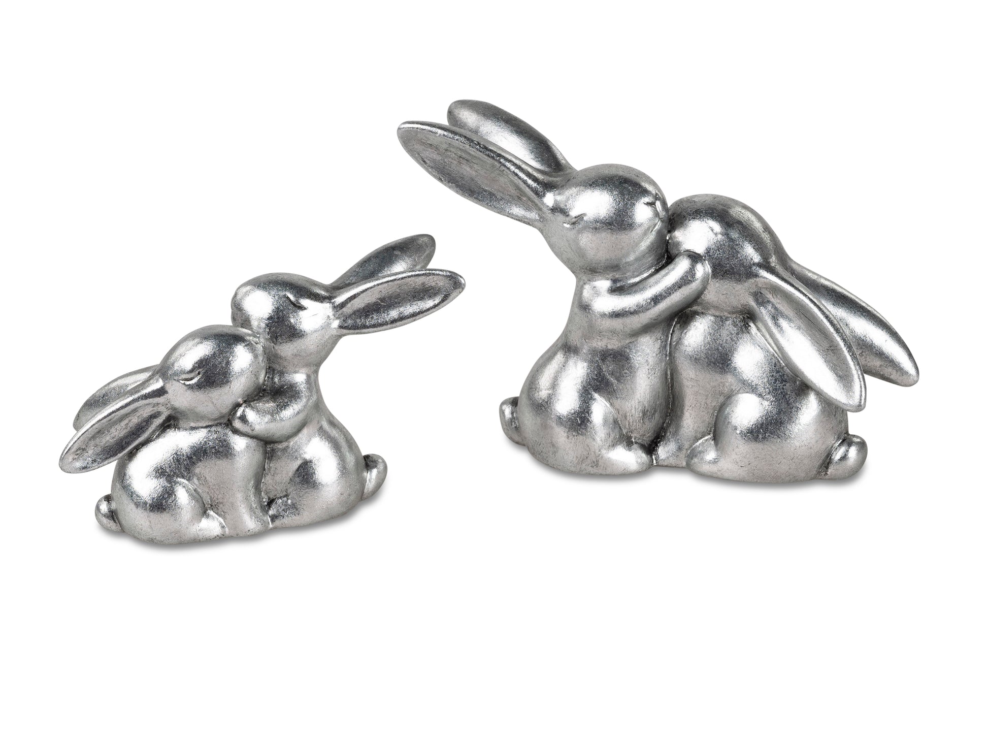 Die silberne Farbgebung verleiht den Hasen eine zeitlose Eleganz, die sich nahtlos in verschiedene Einrichtungsstile einfügt. Ob auf dem Regal, dem Kaminsims oder als Blickfang auf dem Esstisch platziert – dieses Hasenpaar wird sicherlich die Blicke auf sich ziehen.