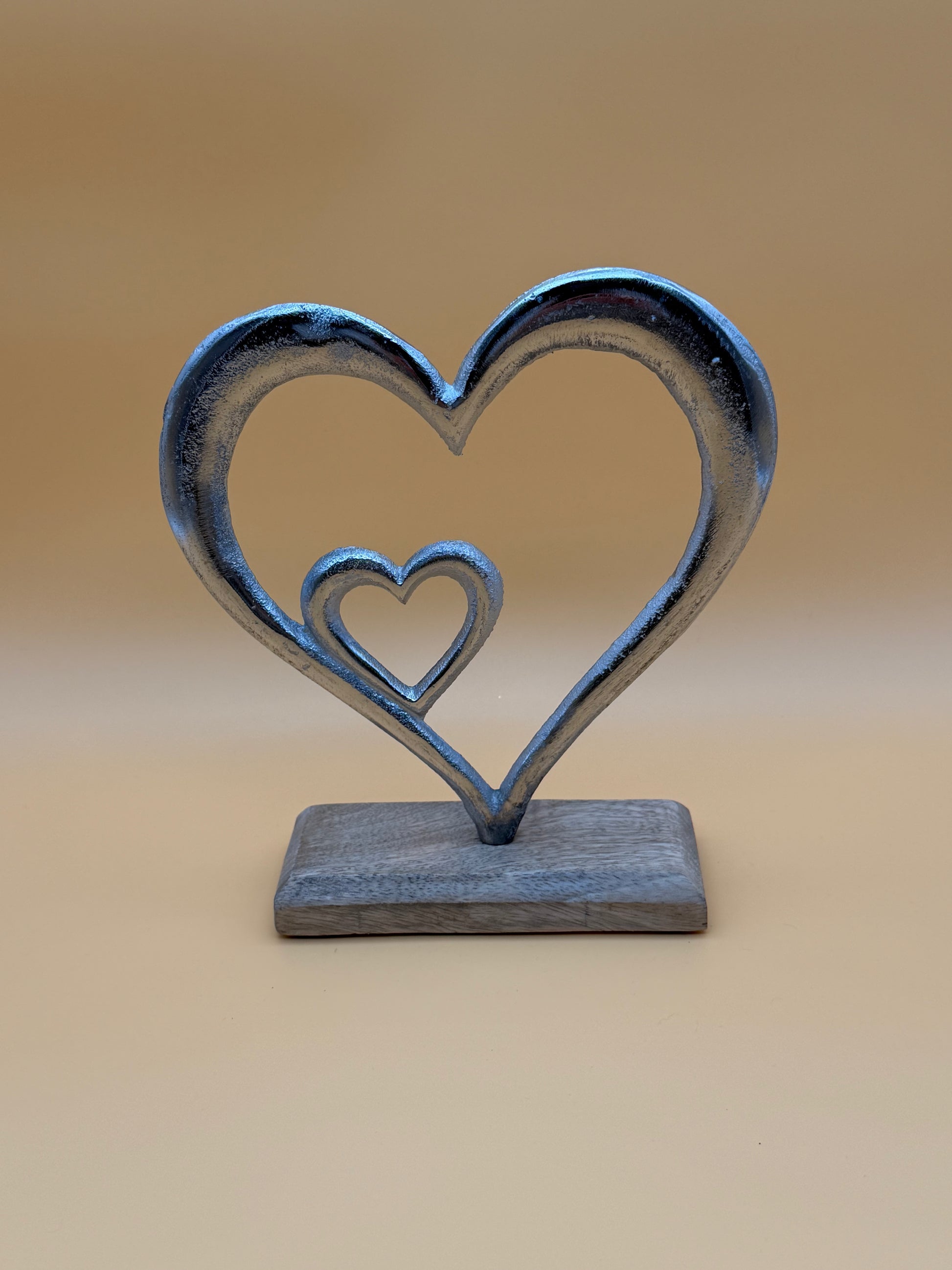 Elegante Herzform aus massivem Mangoholz, montiert auf einem Sockel aus gebürstetem Aluminium – eine raffinierte Komposition hochwertiger Materialien. Die Höhe von 19 cm macht dieses Objekt zu einem subtilen Blickfang für Regale und Oberflächen. Die Kombination aus warmer Holzmaserung und kühlem Metallglanz schafft ein zeitloses Designstück mit handwerklichem Charakter.